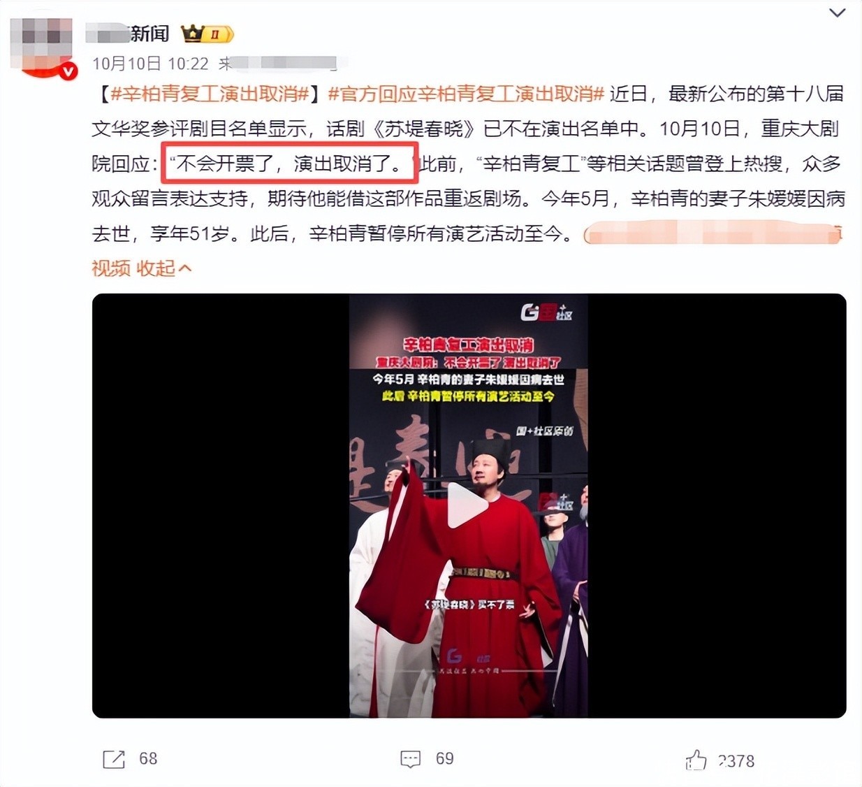 其实想想也完全能理解,几十年的感情怎么可能就用短短几个月的时间就走出伤痛,但就在不久前重庆剧院的官方说他要复工了。