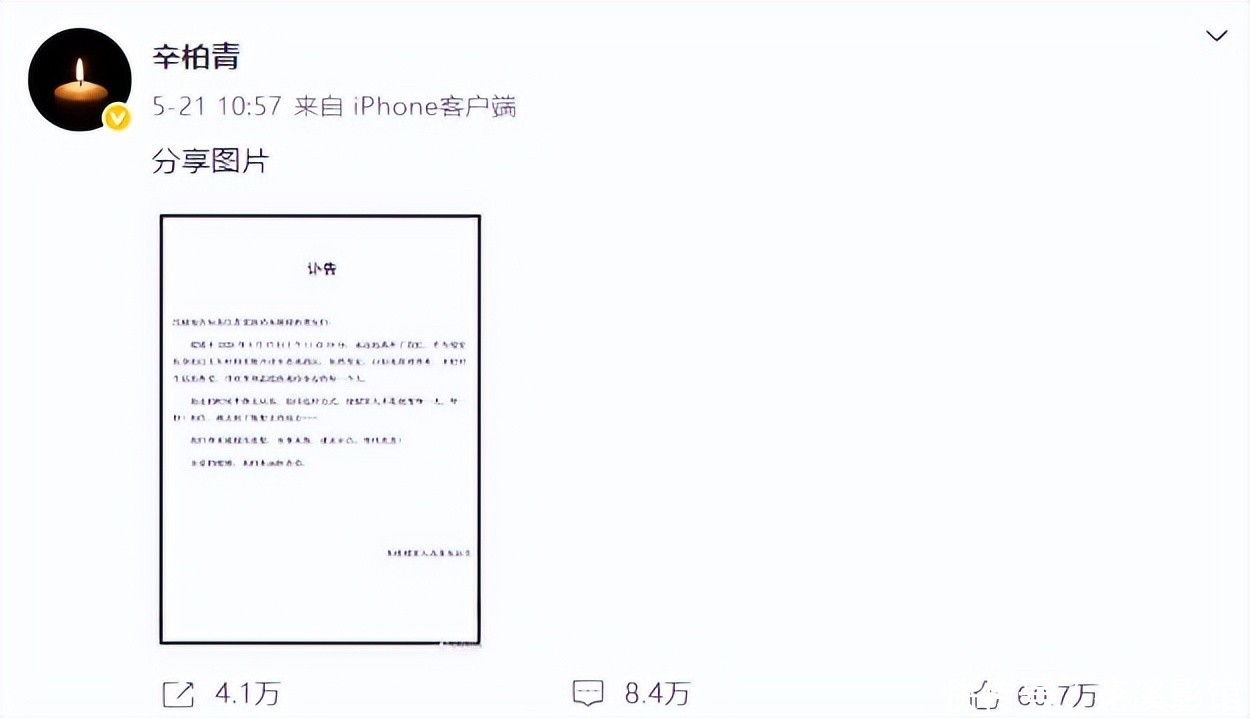 而讣告中写的是17号就去世了,5月21号这天被现在被很多人认为是情人节,“521”谐音过来就是“我爱你”,不知道辛柏青是不是特意挑的这个日子。