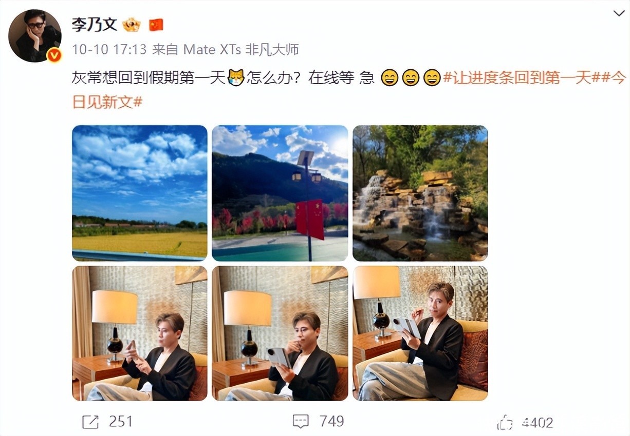 一眼就能看到他发的六张照片,有三张风景照和三张他的照,风景照咱就不说了,就说照片中他的状态。